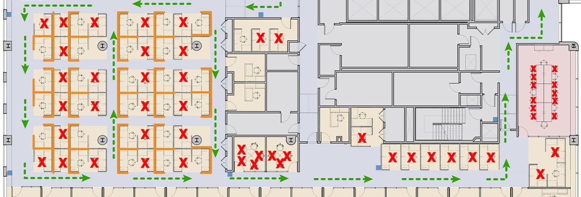 - Modify traffic flow as appropriate. Within the space, create one-way travel paths from the entrance to the main sections of the office. These “lanes” should be clearly marked and identified with signage, floor markings, etc. You should also physically separate workspaces by a least six feet if possible, or mark some as not available for use.